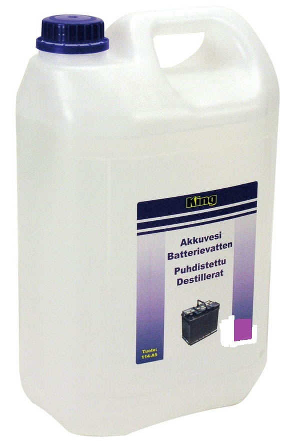 Puhdistettua vettä. Soveltuu kaikkiin akkuihin ja puhdistettua vettä vaativiin kohteisiin. Jäähdytysjärjestelmiin, höyrysilitysrautoihin, höyrykihartimiin, ilmankostuttimiin jne. Max. johtokyky 5 ?S/cm.