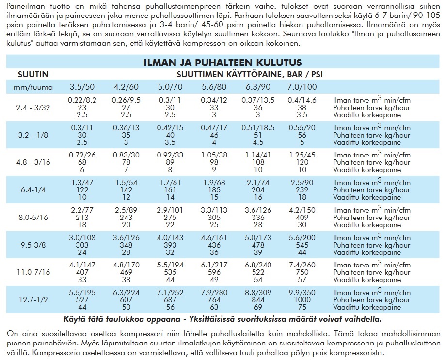 Hiekkapuhallussuutin taulukko