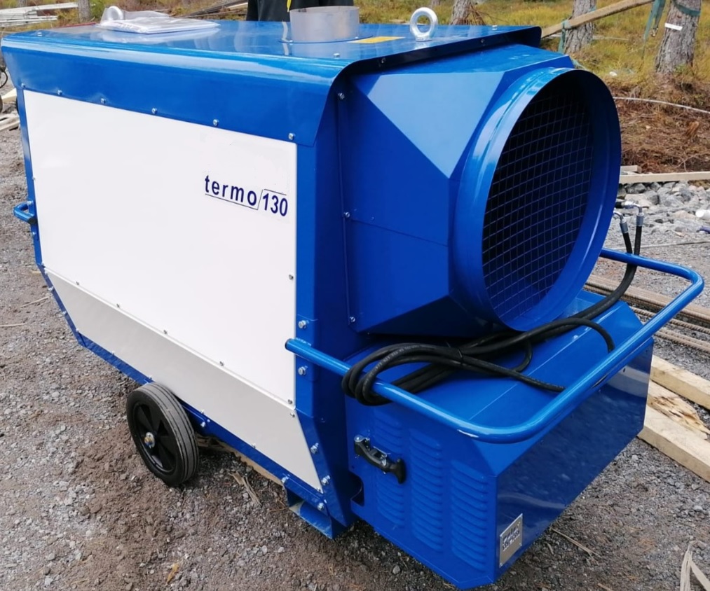 Öljy-/kaasukäyttöinen siirrettävä rakennuslämmitin, joka soveltuu mm. rakennustyömaille, teollisuushalleihin, kylmäilmakuivureihin, kasvihuoneisiin, maatalousrakennuksiin jne.