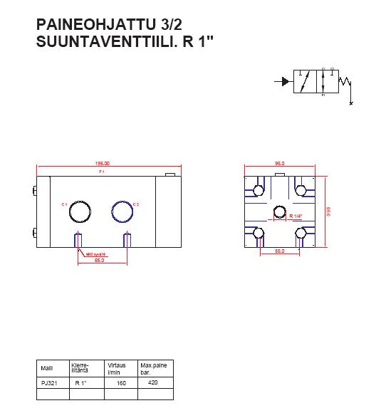 - Paineohjattu 3/2 suuntaventtiili